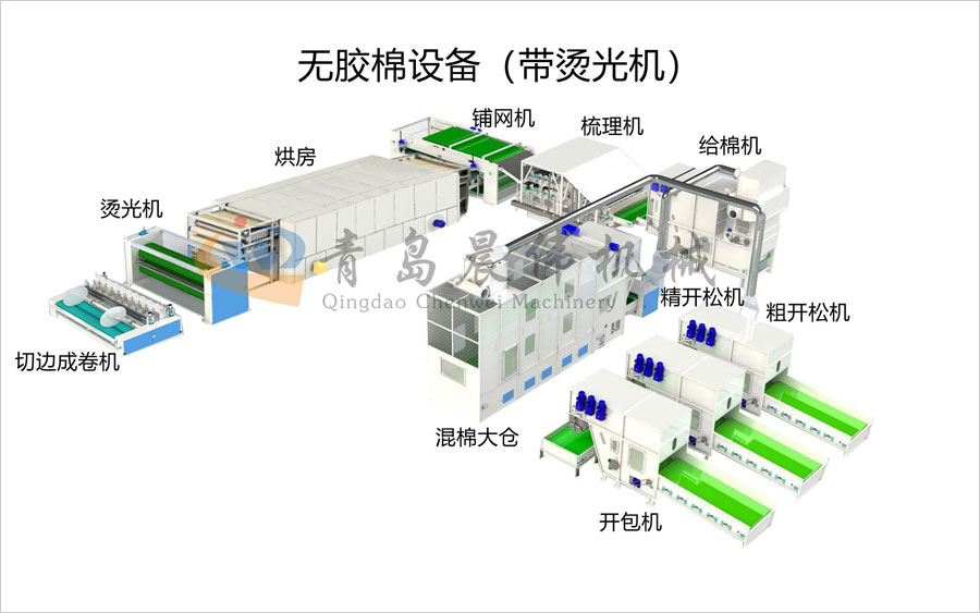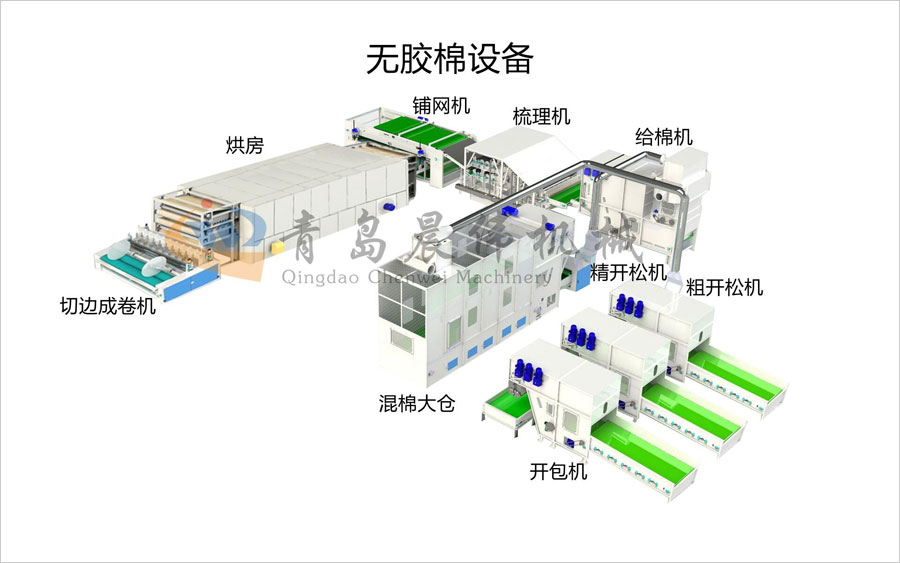 開包機(jī)-開松機(jī)-振動給棉機(jī)-梳理機(jī)-鋪網(wǎng)機(jī)-烘房-切邊成卷機(jī)