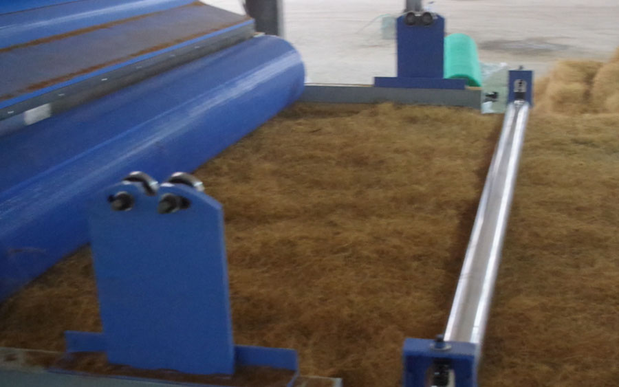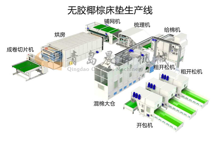 本生產(chǎn)線是利用椰棕纖維和膠水通過高溫熱風穿透粘合定型,通過壓板機多層壓實而成,椰棕墊是床上用品、服裝家具、沙發(fā)高級的芯墊材料。